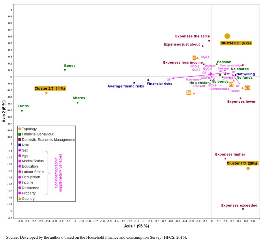 Thus, a central dimension/ axis was found that gave rise to two socio-economic behavioural profiles. One was a moderate investor profile who participates in the financial markets, taking economic risks to a greater extent. The other was a traditional profile that was averse to economic risk and whose main tactic in managing household money is the search for savings.