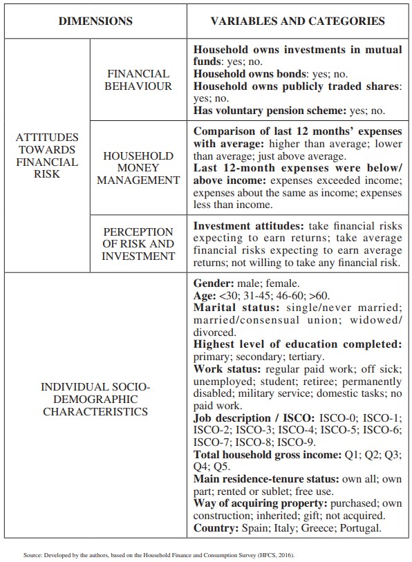 Table 1 shows the variables used in the research. The methodological objective was to determine the differentiation factors between the four countries analysed in order to characterise a model for the financialisation of daily life in southern Europe, specifically differentiating the behaviour of respondents on an individual basis and by country in a subsequent cluster analysis (López-Roldán, 1996; López-Roldán and Fachelli, 2015). For this purpose, an analysis design has been developed where the interrelationships among four initial dimensions have been established, resulting in the joint treatment of 17 original variables. The first three dimensions consist of 7 variables each and operationalise attitudes towards economic risk, whereas the fourth dimension, made up of 9 variables, incorporates individual socio-demographic characteristics. All variables have been treated as categorical, so the age variable has been recoded into ranges, and the household income variable into quintiles.
