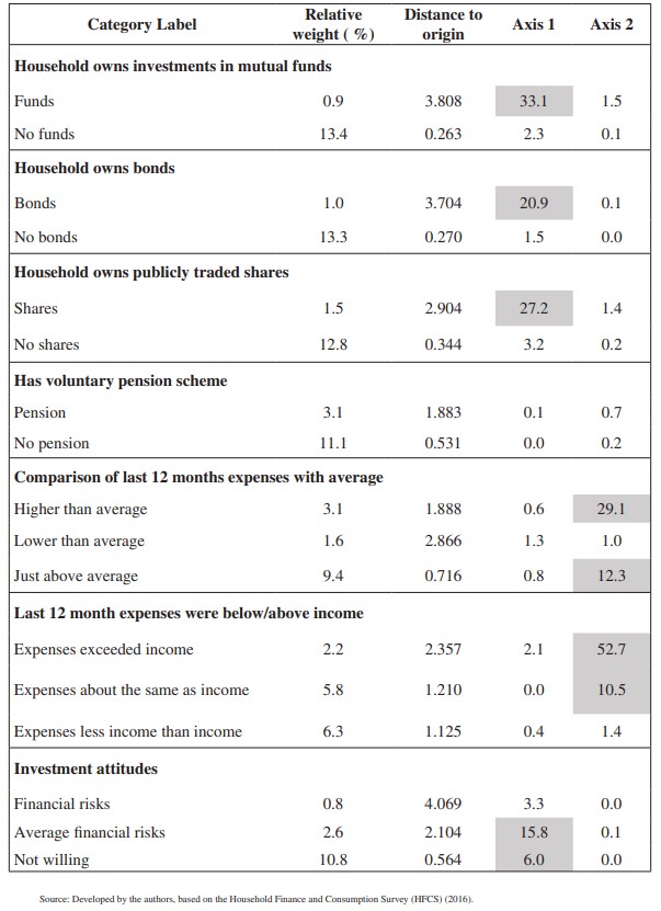The first and foremost dimension was made up of the variables that captured attitudes towards economic risk and ownership of financial assets (‘household investments in mutual funds’, ‘household owns bonds’, ‘household owns publicly traded shares’ and ‘investment attitudes’). According to the contributions of the categories of the active variables (see Table 2 and Figure 2), this factor outlines a profile that holds cautious and moderate behaviour towards financial risk-taking and pension plan provision in opposition to investment in risky financial assets, such as bonds or listed shares.