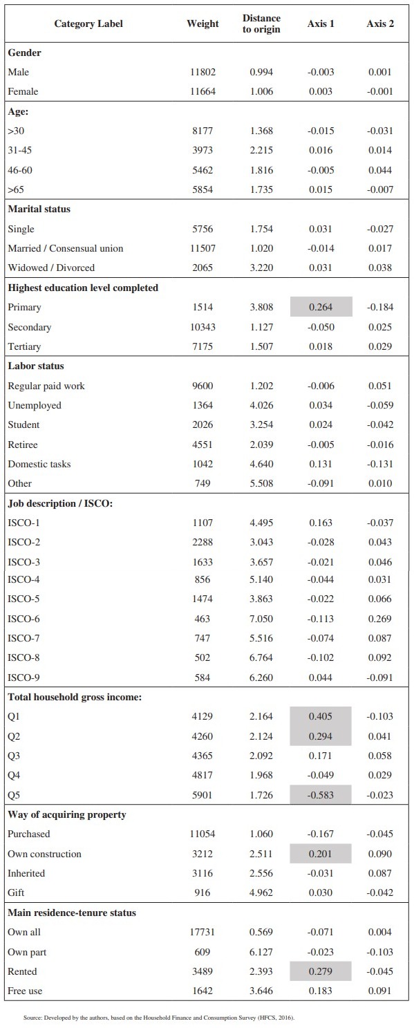 Table 3 shows the coordinates of the supplementary variables introduced in the analysis for illustrative purposes to show the association with the factors obtained and the active variables. The values of the categories, which are very close to the centroid, show that most of the socio-demographic variables did not significantly discriminate between individuals in the analysis. However, the economic level of individuals was relevant. Thus, the weight of the ‘total household gross income’ variable, which indicates the association between the level of income and the financial behaviour of the individuals included in the first dimension, was particularly important: the higher the level of income, the higher the risk and the more financialised behaviour.
