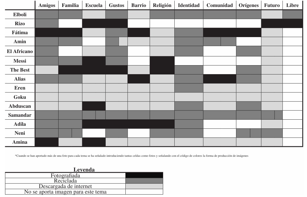 Ahora bien, igual que se observa un efecto fila, existe también un significativa efecto columna o efecto tema. El tema “escuela”, por ejemplo, es el que más fotografías específicamente hechas para la investigación ha recogido; para el tema “identidad”, 11 de las 13 fotografías son recicladas; finalmente para el tema “futuro” 12 de las 16 imágenes fueron descargadas de internet ¿Por qué ciertos temas activan estrategias de producción de imágenes distintas?
