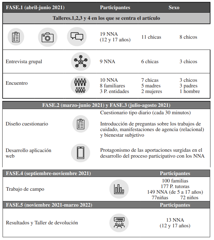 Inicialmente en la primera fase, se realizaron talleres participativos en los que NNA documentaron su vida cotidiana a través de cuestionarios de usos de tiempo y el Fotovoz, una estrategia de investigación-acción participativa que puede contribuir a la movilización en favor del cambio comunitario (Wang, 2006). Además, se organizó una entrevista grupal con NNA y un Encuentro con EPI, EpE, sus familias y las entidades involucradas.