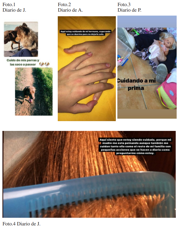 La mayoría de los diarios Fotovoz reflejaron el papel activo de NNA y sus capacidades cuidadoras, respaldando la noción de que esta metodología facilita el énfasis en la agencia de los sujetos (Martínez-Guzmán et al. 2018). Específicamente, estos diarios plasmaron su papel de proveedores de cuidados, principalmente a animales (foto 1) y a los más pequeños de la familia, como hermanos/as, primos/as… (fotos 2, 3), ya resaltado en otras investigaciones (Del Moral y Pérez 2017). Desde la perspectiva inversa, la recepción de los cuidados, las fotografías y los textos ponían el foco en las familias, especialmente en las madres (foto 4), sobre quienes recae mayoritariamente los trabajos de cuidados, lo cual concuerda con el modelo de bienestar familiarista mediterráneo (Moreno y Marí-Klose 2016).