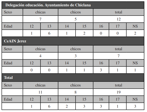 Para la puesta en práctica del proceso participativo, las entidades participantes facilitaron la participación de 19 EpE con edades comprendidas entre los 12 y los 17 años, según muestra la tabla 1: