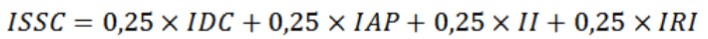 Por último, los índices obtenidos para cada grupo de componentes se integran en un índice que permite obtener una valoración sintética de la sustentabilidad sociocultural de cada bien, siendo este el Índice de Sustentabilidad Sociocultural (ISSC). En la construcción de este último, los valores de los índices parciales se ponderan de manera que cada grupo de variables adquiere un peso semejante, ya que se considera que las cuatro variables son igualmente importantes en el desarrollo de la sustentabilidad sociocultural. De este modo, el ISSC por cada bien patrimonial queda expresado de la siguiente manera: