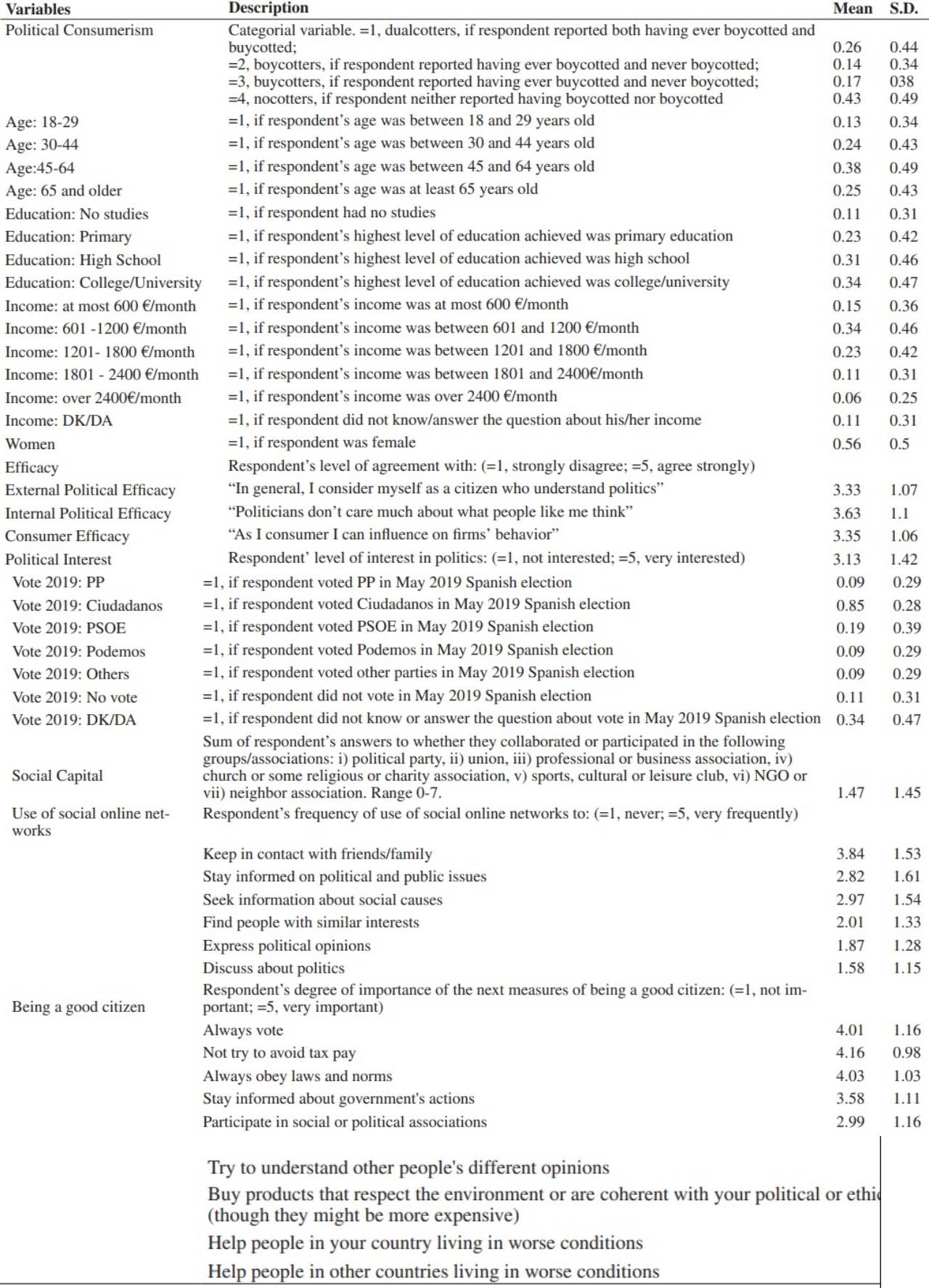 The first set of variables include respondents’ socio-demographic characteristics (age, gender, education, and income), political and consumer efficacy, political interest, vote in the last general elections May 2019 and participation in associations.