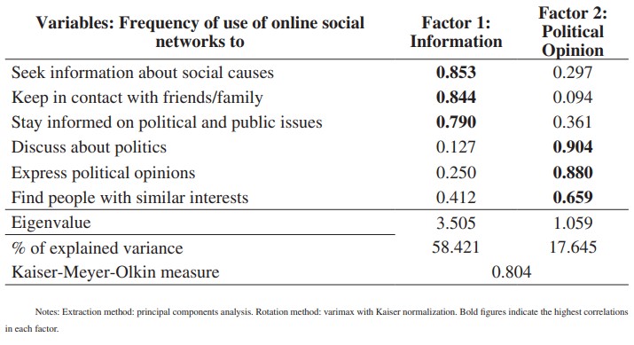 The second set of variables is related to the use of online social networks following the approach of Gil de Zúñiga, Copeland and Bimber (2014). On a scale of 1 “never” to 5 “very frequently”, respondents were asked to indicate the frequency of use of online social networks to keep in contact with friends and family: M=3.84, SD=1.53, stay informed on political and public issues: M=2.82, SD=1.61, seek information about social causes: M=2.97, SD=1.54, find people with similar interests: M=2.01, SD=1.33, express political opinions: M=1.87, SD=1.28 and discuss about politics: M=1.58, SD=1.15. To develop useful measures from these items, the multivariate technique of factor analysis was used. Relying on the eigenvalue criterion, two factors were extracted using principal components analysis with varimax rotation (Table 2). The first factor, labelled “using online social networks for information”, included the following items: seeking information about social causes, keep in contact with friends and family and stay informed on political and public issues (Eigenvalue = 3.505). The second factor, labelled “using social online networks for political opinion,” included the following items: discuss about politics, express political opinions and find people with similar interests (Eigenvalue = 1.059).