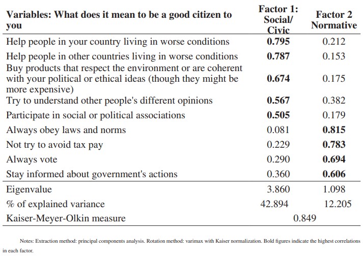 The third and final set of variables refers to citizenship norms. For it, we have considered some of the most common measures of “good citizenship” included in the literature (Dalton 2006; Copeland 2014a; Copeland & Feezell 2017); alongside with the measure “buy products that respect the environment or that are coherent with your political or ethical ideas” though they might be more expensive, which is fairly similar to Zorell & Yang’s (2019) measure “choose products taking care of social and environmental aspects”. On a scale 1 “not important” to 5 “very important”, respondents were asked to indicate the degree of importance of the following indicators of being a good citizen, i.e., always vote: M=4.01, SD=1.16, try not to avoid paying tax: M=4.16, SD=0.98, always obey laws and norms: M=4.03, SD=1.03, stay informed about government’s actions: M=3.58, SD=1.11, participate in social or political associations: M=2.99, SD=1.16, try to understand other people’ opinions: M=3.87, SD=1.05, buy products that respect the environment or that are coherent with your political or ethical ideas though they might be more expensive: M=3.63, SD=1.12, help people in your country living in worse conditions: M=3.95, SD=1.01, and help people in other countries living in worse conditions: 3.82, SD=1.07. Useful measures were developed by means of factor analysis (Table 3). Two factors were extracted using principal components analysis with varimax rotation and applying the eigenvalue criterion. The first one, labelled “engaged citizenship norms”, included the following items: help people in your country living in worse conditions, help people in other countries living in worse conditions, buy products that respect the environment or that are coherent with your political or ethical ideas though they might be more expensive, try to understand other people’s different opinions and participate in social or political associations (Eigenvalue = 3.860). The second one, labelled “citizenship duty norms,” included the following items: always obey laws and norms, try not to avoid paying tax, always vote and stay informed about government actions (Eigenvalue = 1.098).