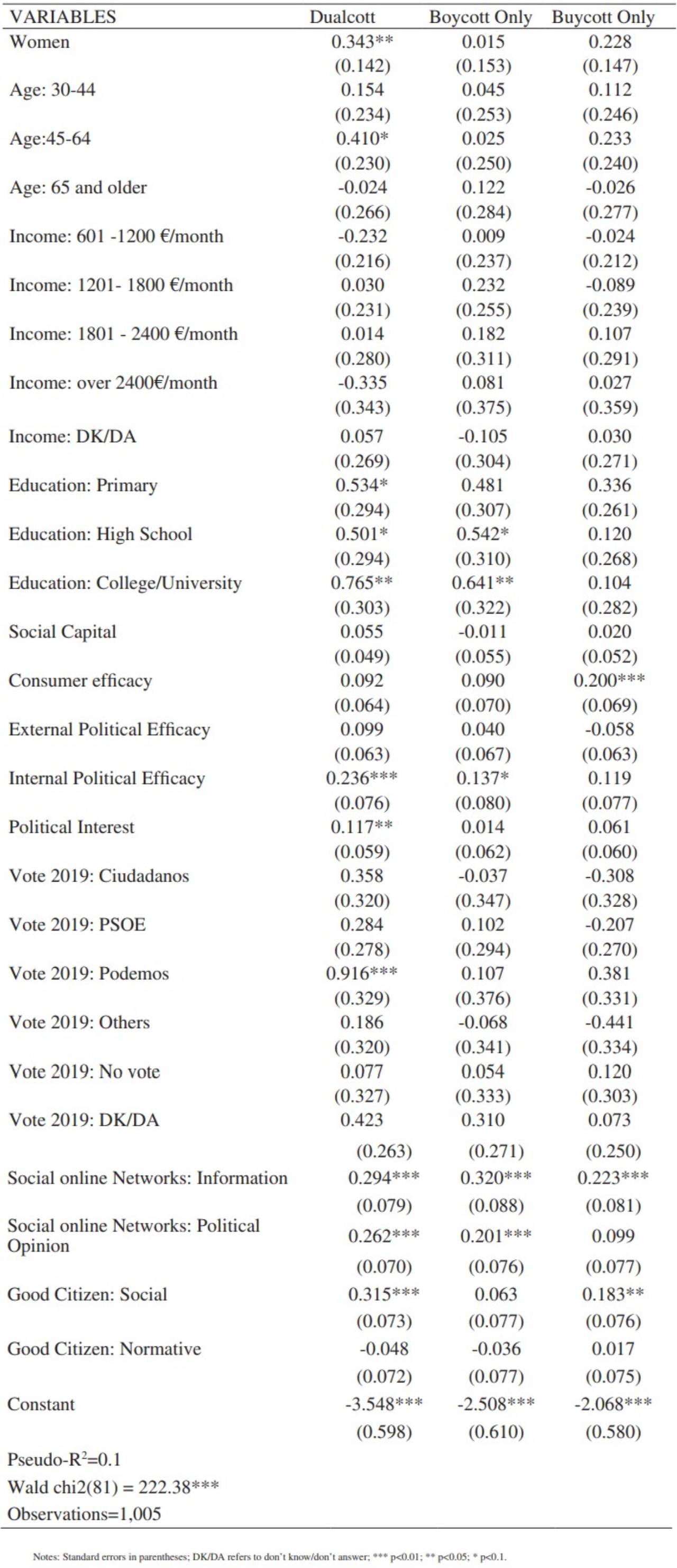 Overall, this piece of work shows that the more intense users of political consumerism, i.e., dualcotters, those who both boycott and buycott, have some particular features that distinguish them from other types of political consumers, those who only boycott and those who only buycott. For dualcotting, resources matter, at least to some extent, as well as attitudinal factors (internal political efficacy and interest), vote, social networks and norms. By contrast, buycotting appears to be shaped by the very particular factor of consumer efficacy. This is a new finding in the literature which open doors to future research into political consumerism, at the same time introducing new questions about the effects which political consumerism might have on companies. Furthermore, our work highlights the relevance of social networks as a main predictor of political consumerism actions and the need to extend the evidence on whether they constitute a single dimension apart from lifestyle politics.