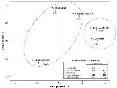 As shown in figure 1 validity analysis of the construct shows the theoretical soundness of the instrument. In effect, openness and Extraversion form just one component, while kindness and responsibility, other. Neuroticism shares both components in a negative way, but with a higher factorial weight on the second one. These relationships are coherent with the theory.