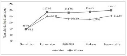 As shown in figure 2 there are similar differences in the personality factors according to gender. Except for the scale of Neuroticism, were the averages are similar for men and women (F=.000, gl=1, p<0.988), in the other factors, women have higher levels of Extraversion, Openness, Kindness and Responsibility.