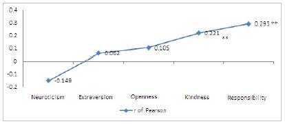There are significant correlations between the gratitude scale and three factors of personality. These are: Kindness (r=.293, p<0.01), Responsibility (r=.221, p<0.01) and -in an inverted sense- with Neuroticism (r=-.149, p<0.05). A significant relationship between gratitude and the factors Extraversion and Openness has not been found, as shown in figure 3.