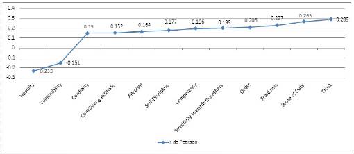 Given that there isn't any correlation between gratitude and the factor of Openness towards experience, there haven't been found significant correlations between gratitude and the dimensions of that factor either. Nevertheless, in the case of the dimensions of the Extraversion Factor, there exists a significant relationship between gratitude and Cordiality ((r=.15, p<0.05). In the case of the dimensions of the Factor Neuroticism, there exists a relationship between gratitude and Hostility (r=-.233, p<0.01) and with Vulnerability too (r=-.151, p<0.05). In the case of the dimensions of the Factor Responsibility, there exists a relationship between gratitude and Competency (r=.196, p<0.05), and Order (r=.206, p<0.05), and Sense of Duty (r=.265, p<0.01) and Self-Discipline (r=.177, p<0.05). In the case of dimensions of the Factor Kindness, there exists a relationship between gratitude and Trust (r=.289, p<0.01), and Frankness (r=.227, p<0.01), and Altruism (r=.164, p<0.05), and Conciliating Attitude (r=.152, p<0.05) and with Sensitivity towards the others (r=.199, p<0.05), as follows in figure 4.