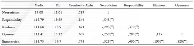 In the present study, almost all dimensions have positive significant correlations between them, except for the neuroticism factor. Reliability values by internal consistency (Cronbach's Alpha) are satisfactory, as shown in table 1.