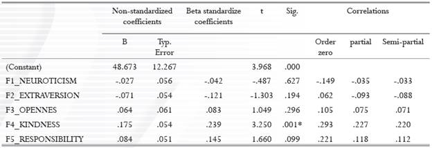 In the Table 3 it can be observed that only the Kindness factor is significantly correlated with Gratitude when the other personality factors are controlled. Kindness explains the 11% of our gratitude scale. On the other hand, the analysis of partial correlations shows that the correlations of the other factors Responsibility and Neuroticism are explained by the association of these last ones with kindness.