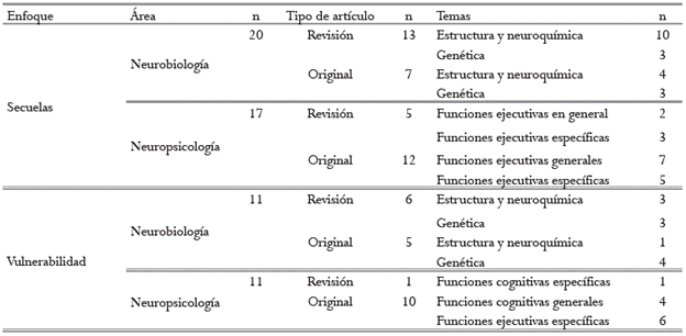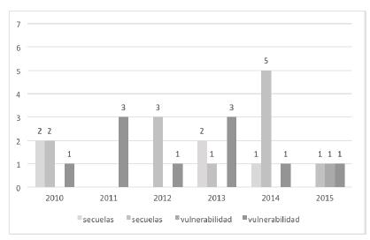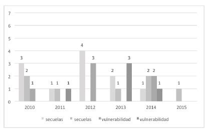 Se encontraron 83 artículos, 24 de ellos fueron descartados porque, aunque incluían en el título las palabras descriptoras, en el contenido se desarrollaba otro tema. Finalmente quedaron 59 artículos, 37 de ellos sobre secuelas y 22 de vulnerabilidad. En la siguiente tabla se encuentran las frecuencias por enfoque, área de experticia, tipo de artículo y tema de los artículos revisados (tabla 1).