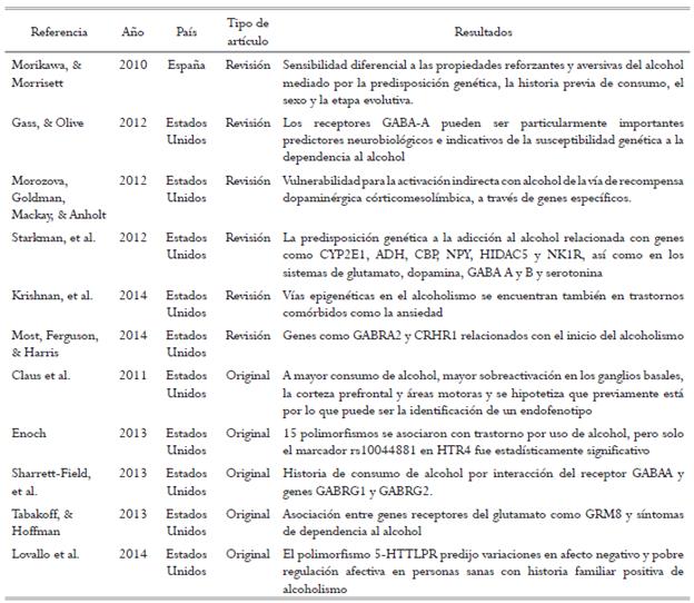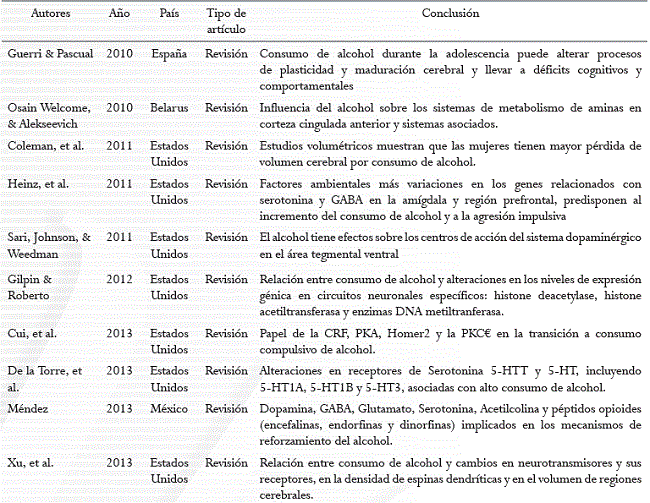 No se evidencian diferencias en la cantidad de artículos producidos en los años 2010 a 2015 bajo los enfoques de secuelas y vulnerabilidad, pero llama la atención que hay un progresivo aumento de artículos originales en los que se presenta el alcoholismo como un factor desencadenante de alteraciones neurobiológicas y neuropsicológicas que están desde antes de iniciar el consumo y son determinantes de las secuelas posteriores. Esto indica que antecedentes en la expresión génica, pueden en relación con las condiciones del ambiente, favorecer un endofenotipo para el alcoholismo, constituyéndose las variaciones neuroanatómicas y neuropsicológicas en una expresión de vulnerabilidad.