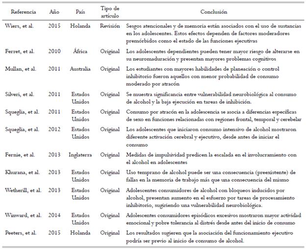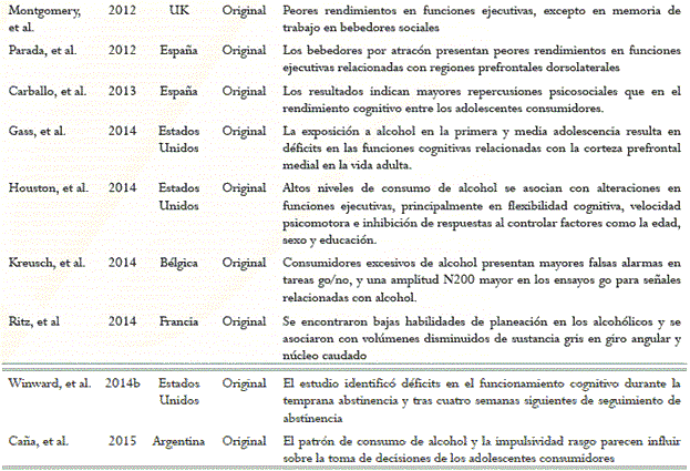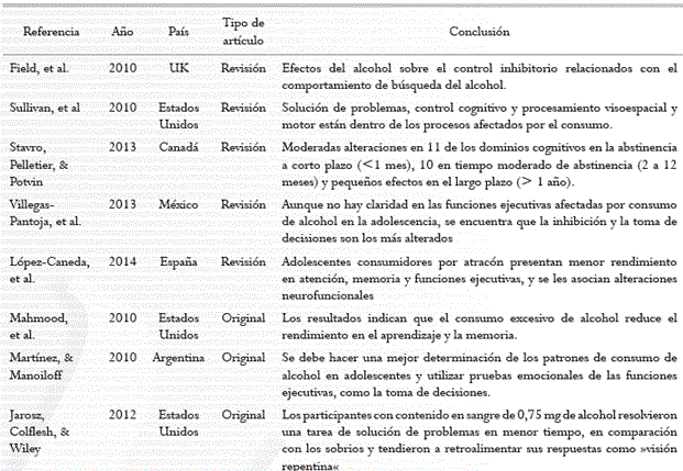 Desde el punto de vista cognitivo se resalta el papel de las funciones ejecutivas en el consumo de alcohol, particularmente la planeación, la solución de problemas, el control inhibitorio (Crean, Tapert, Minassian, MacDonald, & Mason, 2012), la toma de decisiones desventajosa (Goudriaan, Grekin, & Sher, 2007; Xiao et al., 2009) y el comportamiento de riesgo, el aprendizaje de los errores y la evaluación de las consecuencias del propio comportamiento (Clark, 2010; Finn et al., 2002; García-Moreno, Expósito, Sanhueza & Angulo, 2008; George & Koob, 2010; Lyvers & Yakimoff, 2003; Mazas et al., 2000; Monterosso et al., 2001; Squeglia, Spadoni, Infante, Myers, & Tapert, 2009).