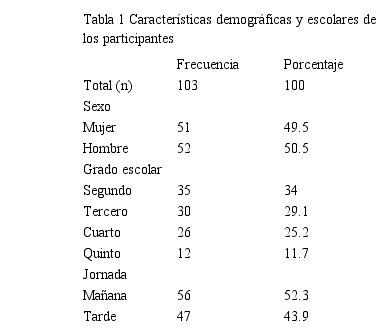 Se seleccionaron 103 estudiantes (52 hombres y 51 mujeres) con una media de edad de 8.9 años (DE = 1,26) de acuerdo con los criterios de elegibilidad establecidos. Los participantes seleccionados cursaban entre grado segundo (34 %) y quinto de primaria (12 %), la participación según la jornada escolar fue similar, presentando la mañana un 52 %.