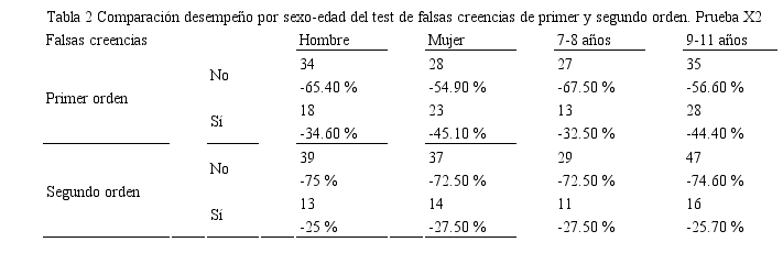Rendimiento en las pruebas de falsas creencias de primer y segundo orden. Mediante la prueba X2 se estableció que no hay diferencias estadísticamente significativas en las pruebas de falsas creencias de primer y de segundo orden comparadas por sexo. Se registró que las mujeres obtuvieron un mayor porcentaje de aciertos con un 45.1 % en tareas de primer orden y 27.5 % en tareas de segundo orden respecto a los aciertos presentados en los hombres.