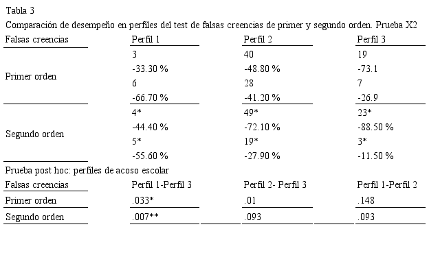 En la comparación realizada entre los perfiles de acoso escolar y las falsas creencias de segundo orden procesada con la prueba X2, se observaron diferencias estadísticamente significativas (p = 0.03) entre los grupos de perfiles de acoso escolar. Con el propósito de establecer específicamente los grupos en los cuales se ubicaban las diferencias, los resultados obtenidos con los contrastes post hoc evidenciaron diferencias en la comparación entre el perfil observador y el perfil observador-víctima-intimidador en el desempeño de las falsas creencias tanto de primer como de segundo orden (Ver Tabla 3).