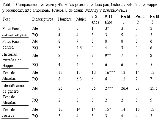 endimiento en las pruebas de faux pas, historias extrañas de Happé y reconocimiento emocional. Como se puede observar en la Tabla 4, la comparación por la variable sexo indicó que el desempeño entre niños y niñas en las pruebas administradas para e