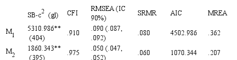 Notas M1 = modelo unidimensional, M2 = modelo de cinco factores relacionados, M3 = modelo jerárquico (cinco factores de primer orden y un factor de segundo orden), SB-χ²= χ² de Satorra-Bentler, CFI = índice de ajuste comparativo, RMSEA = error de aproximación de la raíz cuadrada media, SRMR = raíz cuadrada de la media de residuos al cuadrado, AIC = criterio de información de Akaike, MREA = máximo residual estandarizado absoluto. **p< .01.En la Tabla 2 se incluyen las saturaciones de cada ítem en los distintos factores del CASO. Las saturaciones más altas observadas para cada ítem estaban entre .50 y .80, lo que indica que el ítem posee una fuerte relación con el factor al que pertenece y su capacidad para representarlo. La saturación media (..) de los ítems en sus factores correspondientes (.F1= .69, .F2 = .65, .F3 = .70, .F4 = .70 y .F5 = .60) fue en todos los casos comparativamente mayor que sus correlaciones en los factores restantes (saturaciones estructurales), sugiriendo que cada factor contenía ítems más relacionados con el constructo latente y que están diferenciados con el resto de constructos (evaluados por las otras dimensiones).