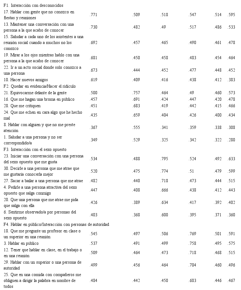 Notas h2 = comunalidad. En negrita saturaciones estandarizadas de los ítems con sus factores.Las correlaciones de Pearson entre las puntuaciones del CASO y la LSAS-SR fueron utilizadas para hallar la validez convergente del primero (Tabla 3). La puntuación total del CASO tuvo una correlación alta con la puntuación total de la LSAS-SR, así como con la subescala de Ansiedad. La correlación con la subescala de Evitación fue moderada. Por otra parte, entre los factores de los dos cuestionarios que tenían nombres similares la correlación fue alta (. > 0,60) en hablar en público o interaccionar con personas de autoridad (F4 del CASO y F1 de la LSAS-SR), y moderada (. > 0,40) en interacción con desconocidos (F1 del CASO y F5 de la LSAS-SR) y en conductas asertivas (F5 del CASO y F3 de la LSAS-SR).