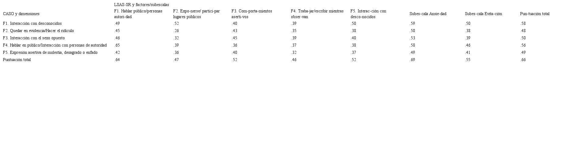 Notas. Los factores de la LSAS-SR corresponden a la subescala de Ansiedad. En negrita las correlaciones entre factores con nombre similar en ambos cuestionarios. Todas las correlaciones fueron estadísticamente significativas (p< .01).