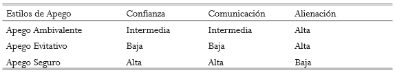 Respecto al apego evitativo, Gómez-Zapiain, Ortiz y Gómez-Lope (2011) refieren que las personas con este tipo de apego desconfían de los miembros de su familia, muestran rechazo e indiferencia hacia lo que representan estos miembros y tienen pocos recuerdos del pasado. Igualmente, predomina en ellos la autosuficiencia, independencia y menosprecian los vínculos afectivos familiares (Guzmán, Carrasco, Figueroa, Trabucco, & Vilca, 2016), además de percibir el mundo como un lugar inseguro e intimidante (Ramos, 2016). Por su parte, Arias, Ávila y Mejía, (2015) refieren que el apego ambivalente se manifiesta en las relaciones afectivas con muestras de desconfianza mezcladas con anhelos de cercanía en medio de un comportamiento temeroso e inseguro.