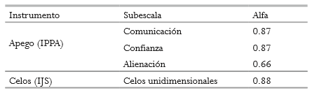 Para medir en los participantes las manifestaciones de los celos, se utilizó la propuesta de Martínez-León et al. (2018), quien evalúa los celos románticos en una sola dimensión a partir de la Escala Interpersonal de los Celos (IJS) adaptada con 18 ítems. Para este estudio, se tuvieron en cuenta los puntajes por encima del percentil 75, considerados perfiles patológicos, y los menores o iguales a 75 como perfiles normales de celos románticos. Con respecto al análisis del apego parental, se tuvo en cuenta la teoría del apego, así como algunos parámetros de clasificación de los estilos de apego propuestos por Vivona (2000), quien realizó dos estudios con el fin de validar el IPPA y la clasificación del apego parental, cuyo resultado coincidió con los tres estilos de apego básicos propuestos por Ainsworth (1978): evitativo, ambivalente y seguro. Estos estudios han logrado presentar evidencia sólida de aspectos psicométricos del IPPA, para ser aplicada en población colombiana, ya que los resultados indicaron altos índices de confiabilidad para las escalas de padres: madre: á = .73 y .90 y padre: á = .78 y .92 (Pardo, Pineda, Carrillo, & Castro, 2006).