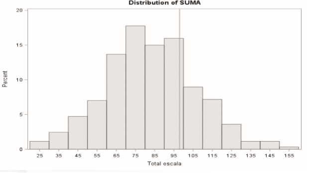 Figura 1. Histograma de frecuencia de la suma de los ítems evaluados en el instrumento de medición de celos interpersonales. Se observan los puntajes, que oscilaron entre 25 y 155, donde el puntaje 98 indica el percentil 75, límite entre los perfiles potenciales de celos patológicos y celos normales.