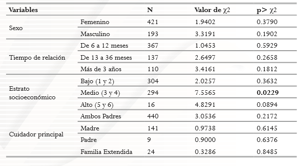En la tabla 4, se presentan los resultados para las diferentes variables de evaluación: sexo, tiempo de la relación, nivel socioeconómico y cuidador principal.
