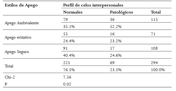 En dicha tabla se observa que el perfil patológico es más frecuente en individuos con estilo de apego ambivalente (52.2%), contrario a los perfiles de celos normales cuyo tipo de apego más probable fue el seguro (40.4%). No obstante, se destaca que, en ambos perfiles de celos, el estilo de apego evitativo fue el menos probable (24.4%) para los celos normales y (23.2%) para los celos patológicos. Hay que mencionar, que en el nivel socioeconómico medio (estrato 3 y 4), predomina el apego inseguro (ambivalente y evitativo) con el 63.3 %, en comparación con el apego seguro que corresponde al 36.7% de la población.