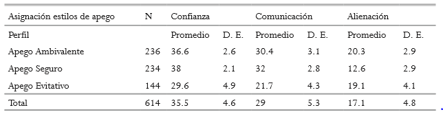 La metodología de Vivona (2000) propone orientar a los encuestados, a que respondan la escala de apego IPPA con respecto al padre con quien siente mayor nivel de apego. Para el caso del presente estudio, se tomaron los valores máximos de calificación para el padre y la madre, donde los valores de cada dimensión fueron tomados de la suma de las preguntas que componían dichas dimensiones, así se definieron los niveles de cada dimensión del apego (comunicación, confianza y alienación). Se realizaron análisis de conglomerados para cada escala, usando el método de K-medias, como lo propone Pardo, Pineda, Carrillo y Castro (2006). Lo anterior se puede observar en las tablas 1 y 2, donde se establecieron tres criterios para definir la clasificación de los conglomerados en relación con los estilos de apego expuestos por Ainsworth (1978), corroborando si los estilos de apego que se encuentran en la literatura se ven reflejados en la muestra de estudiantes universitarios.
