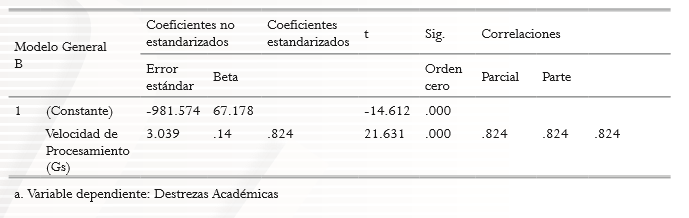 La relación entre las variables se evaluó a través de un coeficiente de correlación, seleccionado a partir de los resultados de la prueba de normalidad. Para determinar la capacidad predictiva de las diferentes pruebas de velocidad de procesamiento, se estimaron dos modelos de regresión lineal; en el primero se utilizó el clúster Gs para predecir las Destrezas Académicas, a este modelo se le denominó Modelo General. Para el segundo, se utilizaron como variables independientes las pruebas de Pareo Visual y Velocidad de Decisión, tratando de identificar el aporte de cada una de ellas a la predicción de las puntuaciones en Destrezas Académicas, este modelo se nombró como Modelo Específico.