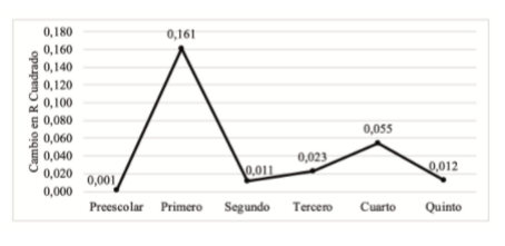 También se observa que hay una pérdida del ajuste de los modelos después del grado de Preescolar, evidente tanto en una reducción del coeficiente de determinación, como en la disminución de los valores de los coeficientes estandarizados en los grados Primero y Segundo, seguido por una recuperación del ajuste y coeficientes en el grado Tercero, tras el cual se observa nuevamente una disminución, particularmente en el componente perceptual de la velocidad de procesamiento, mientras que en el componente conceptual se observa un tercer momento de recuperación de ajuste y relación hacia Quinto de primaria.
