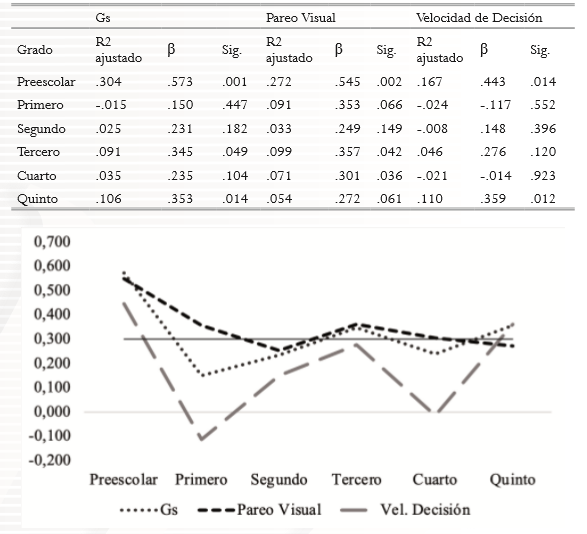 Para analizar la contribución tanto de Gs como de las habilidades específicas en las Destrezas Académicas se analizaron los cambios en los coeficientes beta estandarizados a lo largo del proceso escolar. Este análisis permitió conocer la contribución específica de la habilidad general (Gs) y de cada una las habilidades específicas (Pareo visual y Velocidad de Decisión) en los diferentes grados escolares. En la Tabla 5 se presentan además los coeficientes de determinación para cada grado junto al valor de cada coeficiente estandarizado y su valor de significancia.