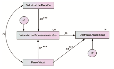 El modelo obtuvo un ajuste adecuado, X2=1.431, p = .232, CFI = 1.000, TLI = .999, NFI = .999, RFI = .996, RMSEA = .044. Las pruebas de Pareo Visual y Velocidad de Decisión presentan coeficientes significativos en cuanto a la predicción de Gs, sin embargo, la Prueba de Pareo Visual contribuye en mayor grado a la predicción de las Destrezas Académicas que el clúster de Velocidad de Procesamiento, teniendo en cuenta que la prueba Velocidad de Decisión no presentó una capacidad predictiva significativa en los modelos de regresión el sendero se retiró del análisis previamente para favorecer su comprensión.