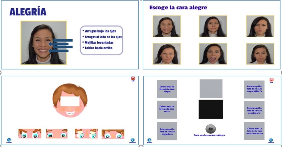 Posterior a esto, se tomaron las fotografías del rostro de las expresiones emocionales de alegría, tristeza, enojo, sorpresa, miedo y asco. Adicionalmente, se solicitó a una diseñadora gráfica la elaboración de las imágenes ilustradas de los rostros con expresiones emocionales en versión masculina y femenina, así como la totalidad de las imágenes de objetos, personajes y escenas a incluir en las actividades del software.