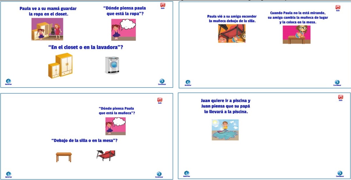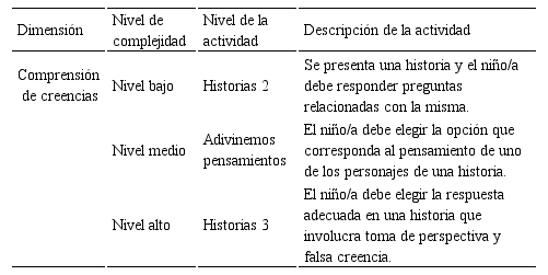 Los ejercicios que conforman esta dimensión implican la asociación de emociones de acuerdo al deseo, la atribución de creencias en los personajes, y la predicción de creencias en los mismos. La tabla 3 presenta una descripción de las actividades que pertenecen a esta dimensión.