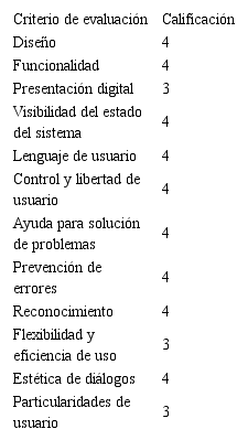 La evaluación por parte del juez experto en ingeniería de sistemas y desarrollo de software tuvo en cuenta los siguientes criterios: diseño de la aplicación, funcionalidad del proyecto, claridad de la presentación digital, visibilidad del estado del sistema, lenguaje de usuario, control y libertad para el usuario, consistencia y estándares, ayuda para reconocer, diagnosticar y solucionar problemas, prevención de errores, reconocimiento antes que recordación, flexibilidad y eficiencia de uso, estética de diálogos y diseño minimalista, particularidades de uso. La calificación se realizó a partir de una escala tipo Likert fundamentada en los siguientes criterios:1 (no cumple), 2 (cumple parcialmente), 3 (cumple en su mayoría), y 4 (cumple totalmente).