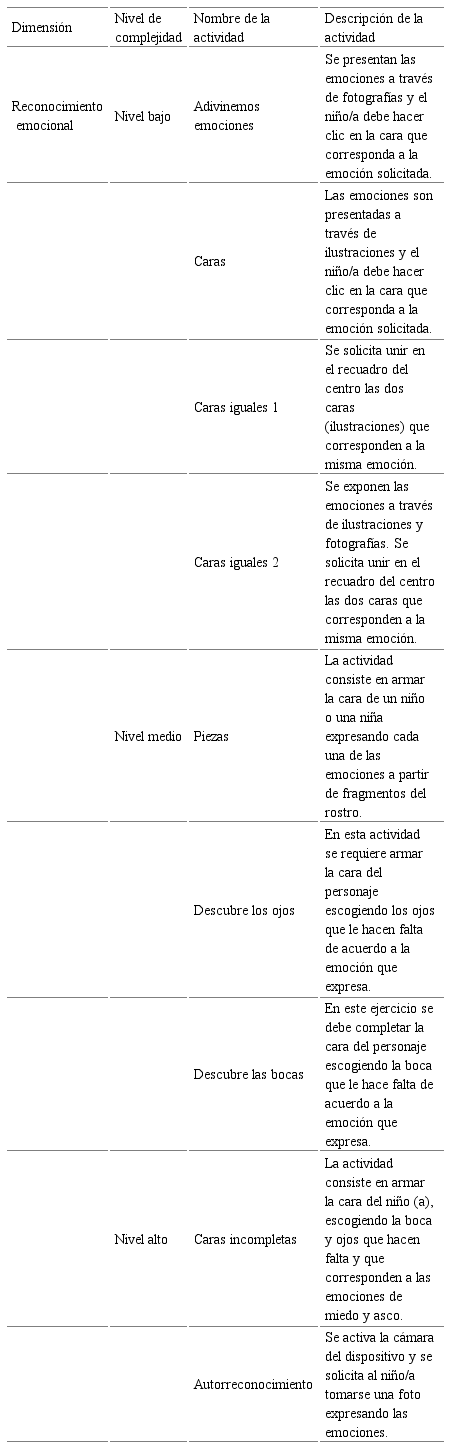 A partir de la teoría de la universalidad de las expresiones faciales de la emoción desarrollada por Ekman y Friesen (1971), se eligieron seis emociones básicas: alegría, tristeza, enojo, sorpresa, asco y miedo, y se incluyeron las micro-expresiones universales descritas por los autores para cada una de estas emociones. Desde esta fundamentación teórica se construyeron las actividades que corresponden a la dimensión “Reconocimiento emocional”, donde se solicita al niño identificar a partir de rostros humanos y animados las emociones básicas mediante diferentes propuestas didácticas. A continuación, se describen en la tabla 1 las actividades realizadas para esta dimensión de acuerdo con el nivel de complejidad, adicionalmente, se exponen algunas imágenes del software