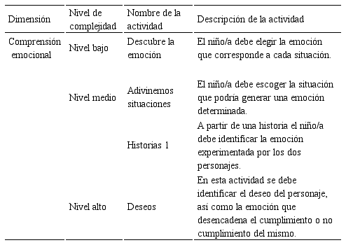 La dimensión de Comprensión emocional contiene ejercicios donde se solicita al niño relacionar emociones con situaciones cotidianas, identificar la emoción de los personajes implicados y atribuir causalidad a las emociones. Esta dimensión comprende situaciones correspondientes a tres contextos principales: contexto de colegio, contexto familiar y contexto de ciudad, con el fin de facilitar la generalización del aprendizaje. Las actividades fueron construidas de acuerdo con las etapas expuestas por Cohen et al. (2006), identificación de emociones basadas en la situación, e identificación de emociones basadas en el deseo. En la tabla 2 se encuentra una descripción de los ejercicios de esta dimensión.