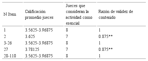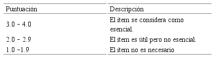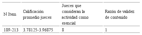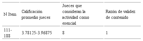 A partir de esta información se obtuvo un promedio de calificación para cada ítem en cada uno de los criterios evaluados, aspecto que permitió evaluar los ítems considerados esenciales a partir de los rangos expuestos en la tabla 4.