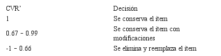 Una vez identificados los ítems esenciales se realizó el análisis estadístico mediante el CVR’, teniendo como referencia las puntuaciones de la tabla 5.