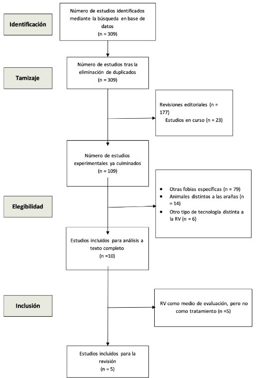 Resumen: El creciente interés que ha traído el estudio de las fobias y entre ellas la fobia específica, ha dado lugar al uso diverso de tratamientos, que incluyen la realidad virtual como técnica innovadora. El presente estudio tuvo como objetivo evaluar el impacto de la Realidad Virtual (RV) como tratamiento para la fobia específica a las arañas, a través de una revisión sistemática de investigaciones que hayan sido publicadas en los últimos 10 años (2008 a 2018) en la base de datos Scopus. La revisión sistemática se realizó bajo los lineamientos de la metodología PRISMA. Inicialmente, se identificaron 309 artículos que contaban con los términos de búsqueda en título, resumen y palabras clave, posteriormente, se seleccionaron 109 estudios experimentales ya culminados, se excluyeron otras fobias específicas y otros tipos de tecnologías, siendo seleccionados 10 artículos para análisis a texto completo, incluyendo así solo 5 artículos para la revisión, que usaban la realidad virtual como tratamiento. Acorde a los resultados se encontró evidencia que sugiere que este tipo de intervenciones pueden ser relativamente eficaces para abordar esta problemática, ya que los resultados indican disminución significativa en indicadores clínicos, pero existen también varias limitaciones de orden metodológico. Se espera que esta revisión sistemática promueva investigaciones que usen la realidad virtual como tratamiento para la fobia específica a las arañas, mejorando las limitaciones identificadas en el estudio.