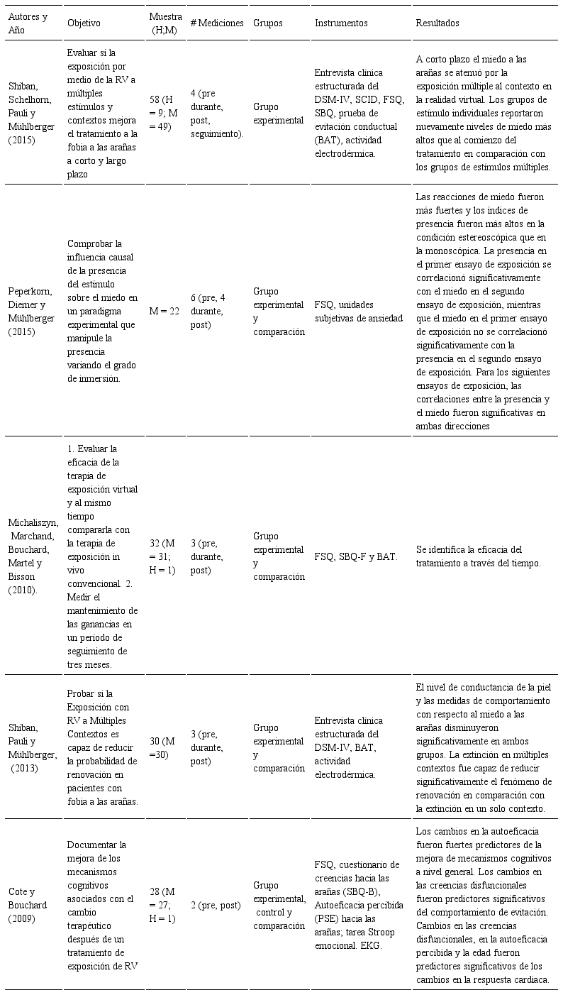 El objetivo del presente estudio fue evaluar el impacto de la RV como tratamiento para la fobia específica a las arañas a través de una revisión sistemática de investigaciones. Se encontró evidencia que sugiere que este tipo de tratamiento puede ser relativamente eficaz para abordar esta problemática, ya que los resultados indican disminución significativa en indicadores clínicos, pero existen también varias limitaciones de orden metodológico. Asimismo, se encontró que en promedio la muestra estuvo compuesta por 34 personas, con unas mediciones de pre, durante y post tratamiento por medio de grupos experimentales, grupo control y grupo comparación. Con respecto a los instrumentos utilizados se encontró que uno de los más usados es el FSQ, el cual es un cuestionario para medir miedo a las arañas.