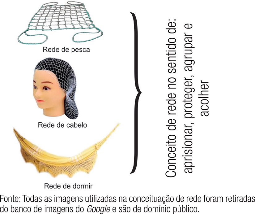 No primeiro caso, as imagens-objetos relacionados com esse sentido são exemplificadas com os objetos rede de pesca, de cabelo, de dormir; há também um sentido figurado, em situações em que uma pessoa pode se envolver numa “rede de intrigas”. Na imagem 2, exemplificamos as definições encontradas nos dicionários citados.