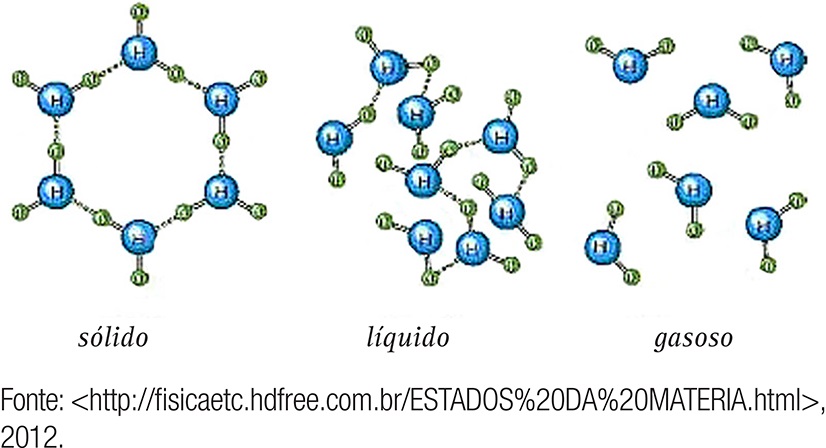 A ligação covalente (linha), entretanto, é intramolecular, ou seja, apenas une os átomos que formam a molécula. Em termos químicos, portanto, o que impede que todas as moléculas em um copo de água se difundam instantaneamente pelo meio, deixando o copo vazio? O que as mantém unidas? Ou, ainda, o que possibilita que se transformem num objeto sólido, compacto, quando resfriadas? As ciências químicas já nos responderam essa questão, informando-nos que as forças que existem entre as moléculas – forças intermoleculares – não são tão poderosas quanto as ligações iônicas ou covalentes, mas são muito importantes; sobretudo quando se deseja explicar as propriedades macroscópicas da substância, ou seja, como os corpos se mantêm na forma de matéria. São essas forças as responsáveis pela existência dos três estados físicos. Sem elas, só existiriam gases.